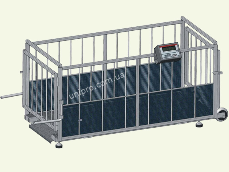 Весы для взвешивания свиней производства Весы АКСИС Украина серии 4BDU...Х "СТАНДАРТ" состоят из приемной платформы и специальных пандусов с рифленой поверхностью, ограждения зашитого перфорированным листом с двумя входами высотой 650мм, 2 (двух) колес и 2 (двух) ручек для перевозки, четырех тензометрических датчиков ІР68 (Vishay Tedea-Huntleigh), коммутаторной коробки и весопроцессора SE-01/A/18/RS/VK (высота цифр 18 мм, LED, корпус выполнен из алюминиевого сплава, класс защиты ІР65) фирмы "AXIS" к с автономным питанием (> 20часов работы).