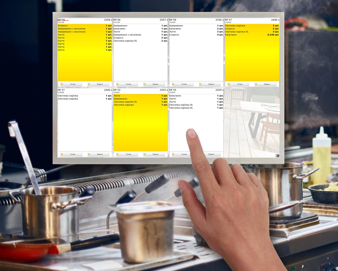 Как только клиент делает заказ в зале ресторана или на стойке фастфуда , он появляется на дисплее на кухне. Кроме того, повар может устанавливать статус приготовления и никакие принтеры чеков или кухонные звонки для этого не нужны.