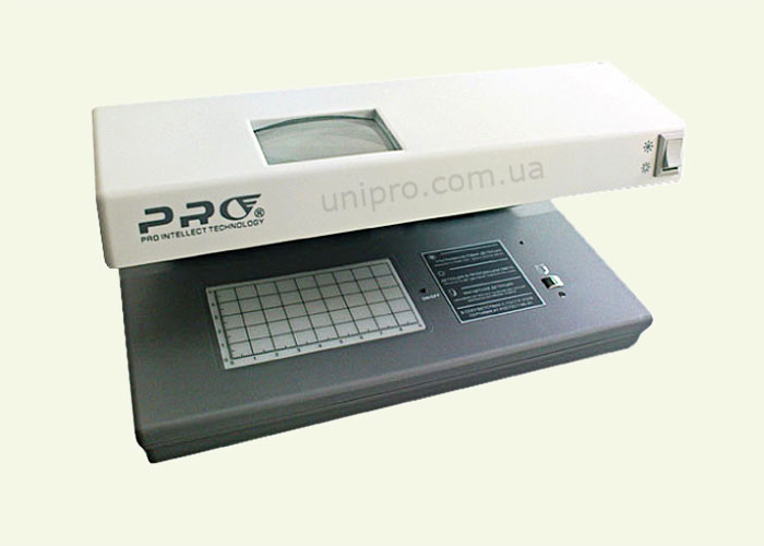 Детектор PRO 12 оборудован таким образом, чтобы его было удобно использовать на столе, у него имеется нижняя грань, на которой и стоит сам детектор валют. К верхней стороне детектора валют крепятся две ультрафиолетовые лампы, которые вместе дают мощность 12 Ватт. Сами размеры детектора валют PRO 12 немного расширены, что позволяет одновременно проверять несколько купюр, банкнот, документов. Так же в задней стенке детекторы имеется отверстие, благодаря которому можно проверять большие документы, например листы формата А4.